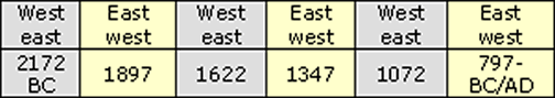 I believe that the Antikythera Clock can be set and aligned in any century between 2287 BC to 518 BC and must be adjusted to a particular cycle of a solstice-equinox position coinciding perhaps with the Great Pyramid’s Draco constellation as a reference point. One needs only to remember what year is generated on a table. We are counting from our time (2006) back toward the beginning of time - Adam and Eve at 4068 BC using the Hebrew calendar or even further (4488 BC) using the Aztec calendar. However, ancient calendars would have counted forward from the asteroid impact on 5 February 2287 BC - according to the Gregorian calendar, which is 4,293 years before 2006.